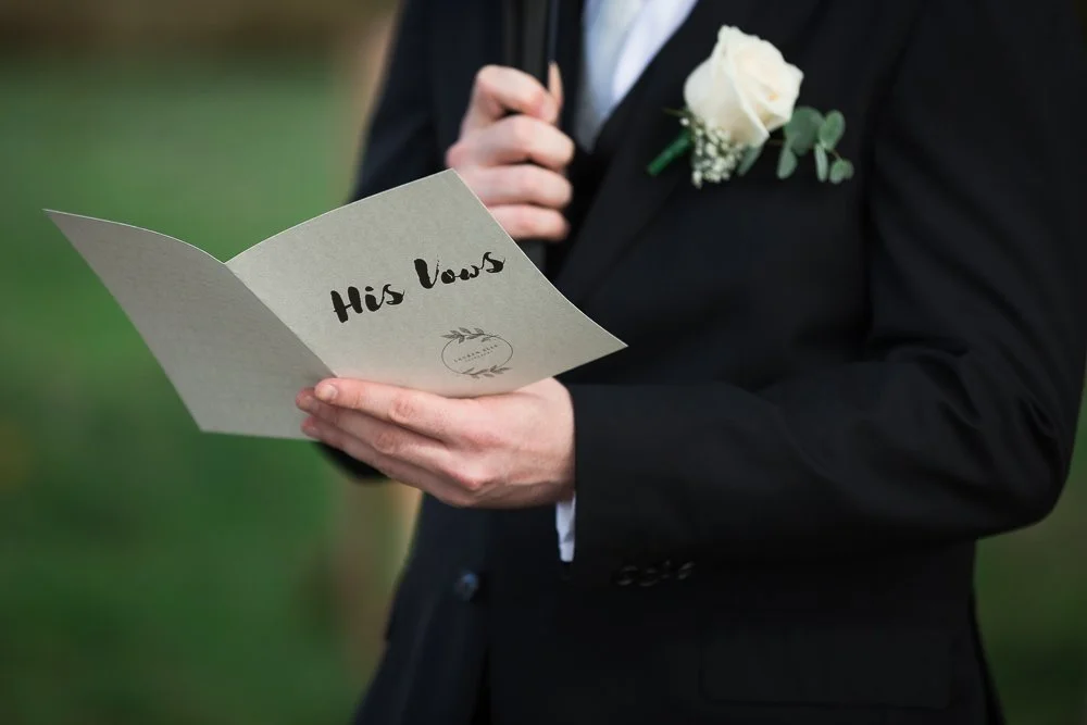 Have your vows on index cards or a vows card. A sheet of Reflex paper out of the photocopier is not the right look. It’s so important to be familiar with your vows. A wedding is like a piece of theatre and no one wants to go onstage in front of everyone without a good working knowledge of their lines.