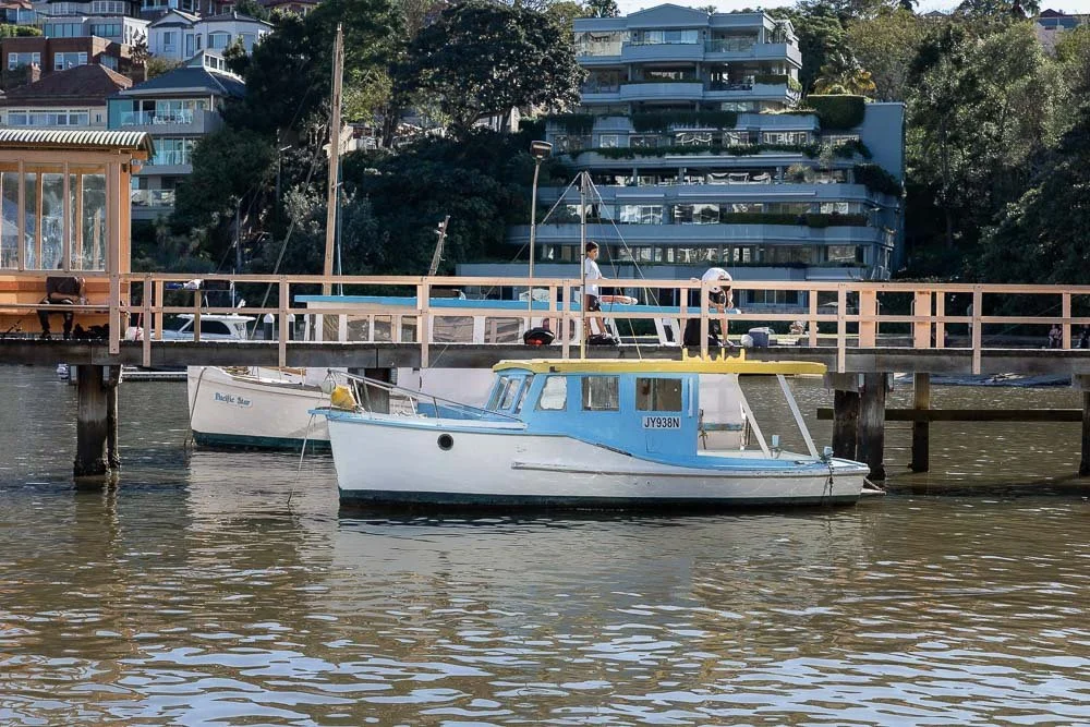 The warm orange and brown paintwork of the wharf are a perfect complement to the blue of the sky and water. Even the boats at anchor match the colour palette, which adds to the sense that thisis a scene from a movie.